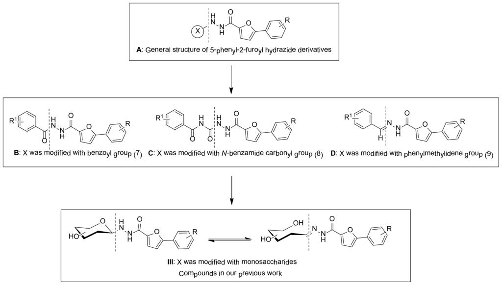 In our previous work, based on the hydrazide moiety, some diacylhydrazines (B, Scheme 1) [20–24], semicarbazides (C, Scheme 1) [25], and acylhydrazones (D, Scheme 1) [26,27] derivatives containing 5-phenyl-2-furan were designed and synthesized. All the compounds showed diverse and significant bioactivities such as fungicidal, insecticidal, and antitumor activities. In continuation of our research on the synthesis of biological heterocyclic compounds, a series of novel glycosyl hydrazide derivatives containing 5-phenyl-2-furan moiety were designed and synthesized (Scheme 1). The ring-chain isomers were investigated by 1H NMR spectroscopy. Their antifungal and antitumor activities were evaluated.