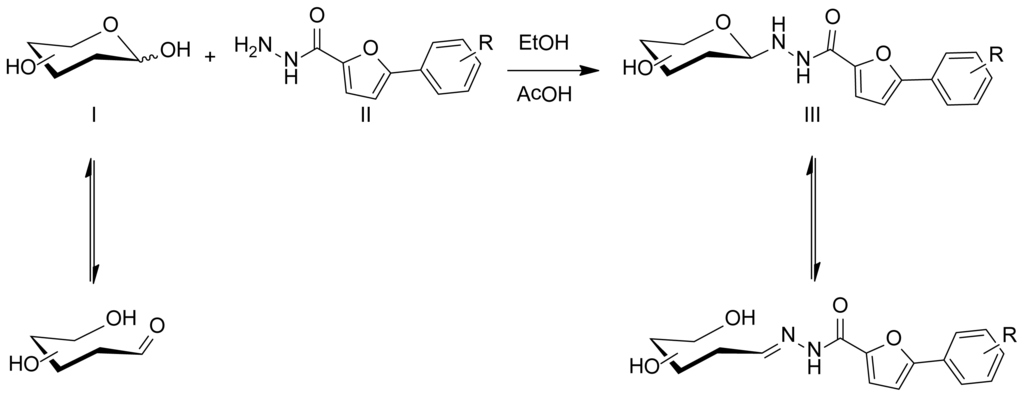 A mixture of monosaccaride I (0.05 mol) and 5-substituted phenyl-2-furoyl hydrazide II (0.05 mol) reacted in ethanol under reflux for 6–8 h. The reaction was catalyzed by drops of acetic acid. After cooling, the solvent was removed under reduced pressure, and the solid was recrystallized from ethanol to obtain the target compounds III.
