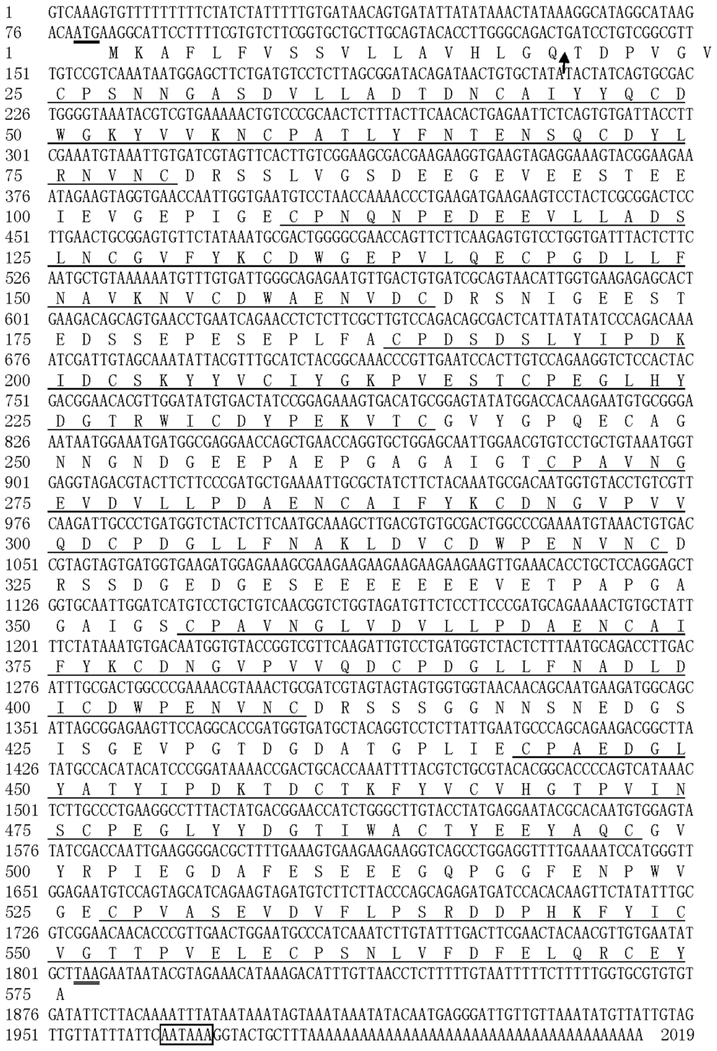 Nucleotide sequence of the cDNA for HoCBP76 and its deduced amino acid sequence (GenBank™ accession number: HM596340). The translation initiation codon ATG and stop codon TAA are double underlined. The predicted signal peptide cleavage site is indicated by a vertical arrow. The potential polyadenylation signal sequence is marked in a box. Eight chitin binding domains are underlined from N- to C-terminus of the protein.