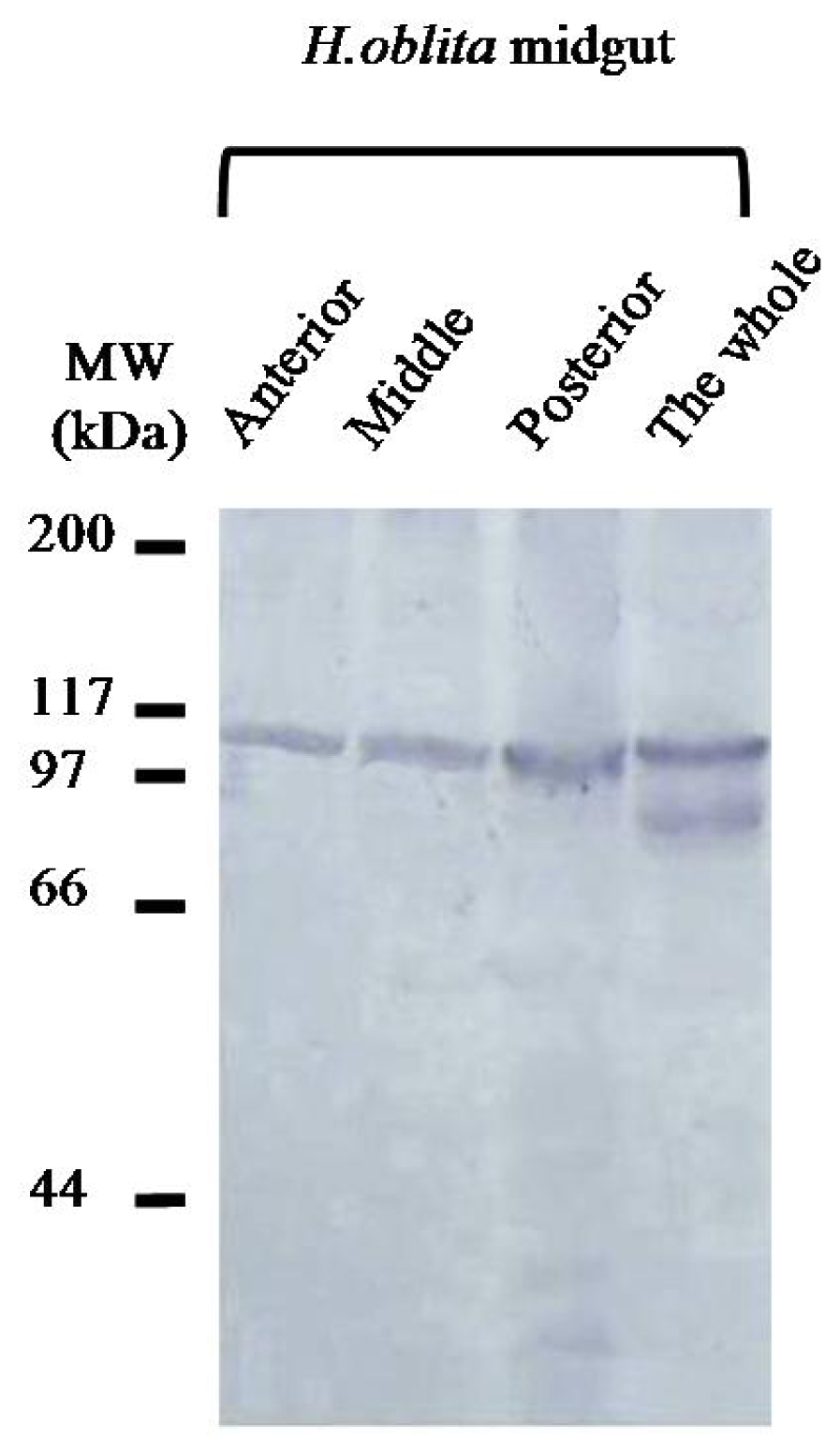 Identification of HoCBP76from H. oblita larval midgut proteins by western blot analysis with antibodies specific to HoCBP76. Proteins were from the anterior, middle, posterior regions of the H. oblita midgut epithelium and the whole midgut epithelium.
