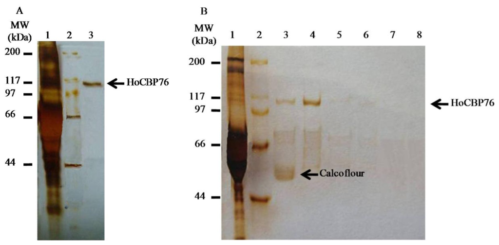 SDS-PAGE analysis of chitin binding activity of recombinant HoCBP76. (A) Silver staining analysis of recombinant HoCBP76 expressed in insect cells using recombinant baculovirus. Lane 1: culture media from HighFive cells infected with vHoCBP76, showing that the recombinant HoCBP76 was secreted into the medium. Lane 2: protein marker. Lane 3: chitin bound protein from the media of vHoCBP76 infected HighFive cells; (B) Silver staining analysis of recombinant HoCBP76 dissociated from the HoCBP76/regenerated chitin complex by different treatment. Lane 1: culture media from HighFive cells infected with vHoCBP76. Lane 2: protein marker. Lane 3–8: HoCBP76/regenerated chitin complex by incubation with 1% Calcoflour, 6 M Urea, 2% SDS + 5% β-ME, 2% SDS, PBS and 1 M NaCl, respectively.