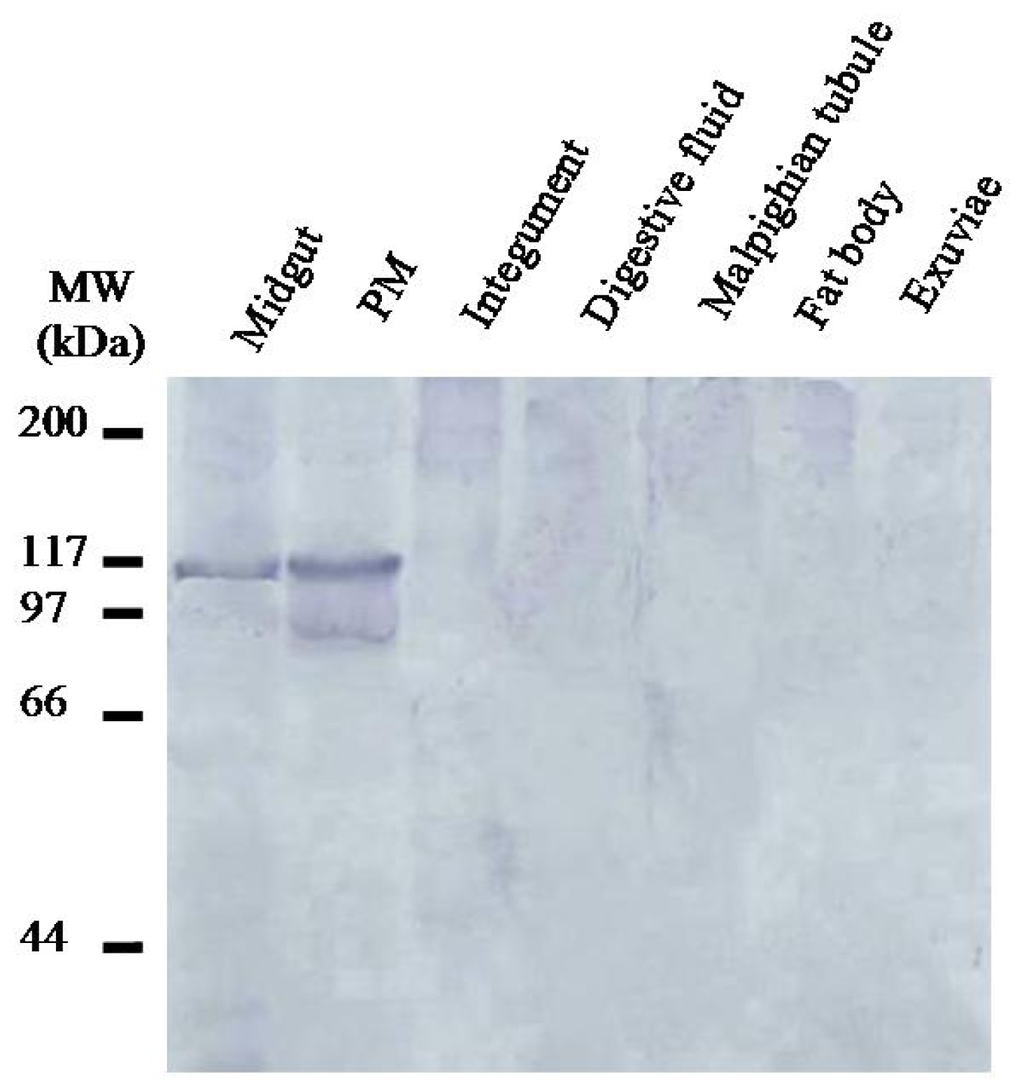 Western blot analysis of proteins from various tissues isolated from third instar H. oblita larvae showed that in addition to the PM, HoCBP76 was detected in midgut tissue but was not detectable from the larvalintegument, digestive fluid, Malpighian tubules, fat body and exuvia. In proteins from the PM, a main band and a number of minor bands with lower molecular weights were detected by Western blot ananlysis. The minor bands could be degradation products of HoCBP76. The expression showed some similar with that of TnPM-P42 protein, another PM protein without peritrophin domains in Trichoplusia ni. The TnPM-P42 protein was only expressed in the PM of midgut, not in hemolymph, Malpighian tubules, salivary glands, fat body, or integument [25].
