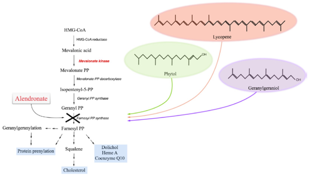 Schematic representation of the mevalonate pathway. Compounds used in the experiments are indicated alongside the pathway: alendronate was used to biochemically block the pathway, while isoprenoids were used to rescue it.