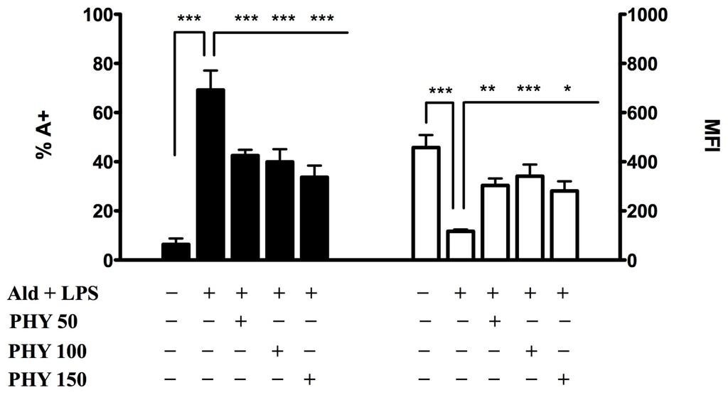 The percentage of programmed cell death (PCD) was significantly reduced after PHY treatments, irrespective of the concentration used (PHY 50 + Ald + LPS: 42.6 ± 2.3, p < 0.001; PHY 100 + Ald + LPS: 39.9 ± 5.1, p < 0.001; PHY 150 + Ald + LPS: 33.7 ± 4.7, p < 0.001), compared to Ald + LPS. Comparisons within the same group (Ald + LPS) showed that MFI values were significantly increased after treatment with PHY 50 and 100 μM, and less markedly increased after PHY 150 μM treatment (PHY 50 + Ald + LPS: 304.0 ± 27.8, p < 0.01; PHY 100 + Ald + LPS: 341.7 ± 47.1, p < 0.001; PHY 150 + Ald + LPS: 281.7 ± 38.7, p < 0.05) (Figure 2).