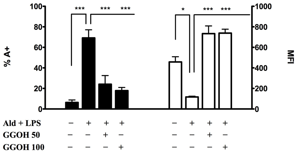 All tested concentrations of geranylgeraniol (GGOH) significantly affected the evaluated markers: percentages of PCD were dramatically decreased (GGOH 50 + Ald + LPS: 24.1 ± 8.5, p < 0.001; GGOH 100 + Ald + LPS: 17.9 ± 3.1, p < 0.001), while MFI values were greatly increased (GGOH 50 + Ald + LPS: 734.0 ± 74.9, p < 0.001; GGOH 100 + Ald + LPS: 738.5 ± 38.9, p < 0.001) (Figure 3).