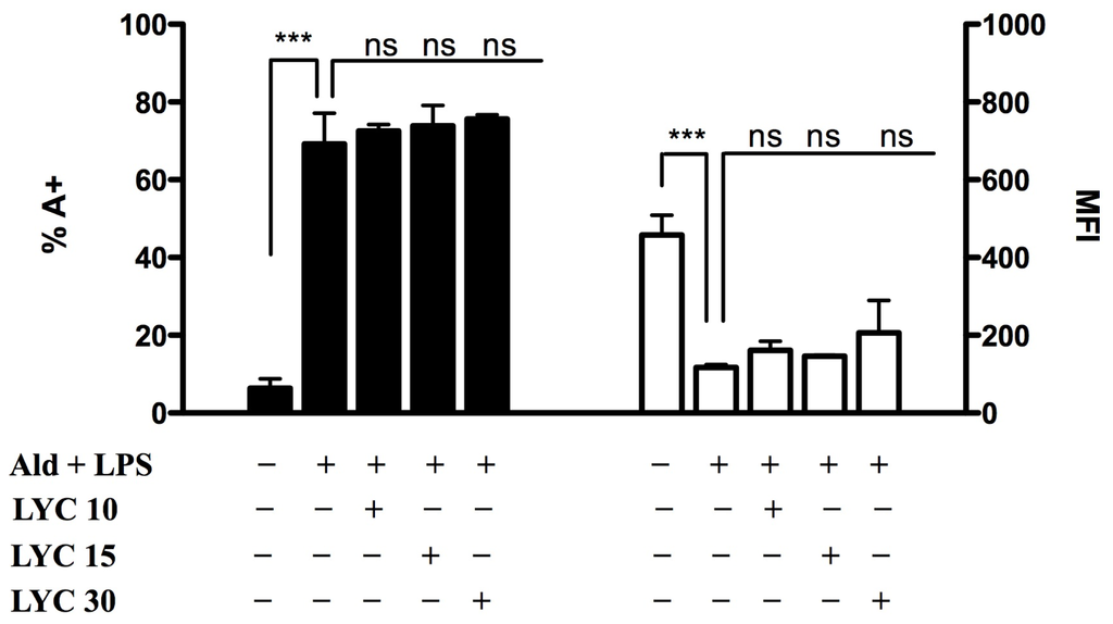None of tested concentrations of LYC was able to affect either PCD or MFI, when compared to Ald + LPS (PCD: LYC 10 + Ald + LPS: 72.5 ± 1.6; LYC 15 + Ald + LPS: 73.8 ± 5.3; LYC 30 + Ald + LPS: 75.6 ± 1.1; MFI: LYC 10 + Ald + LPS: 161.5 ± 93.3; LYC15 + Ald + LPS: 146.5 ± 2.1; LYC30 + Ald + LPS: 206.5 ± 82.7) (Figure 4).