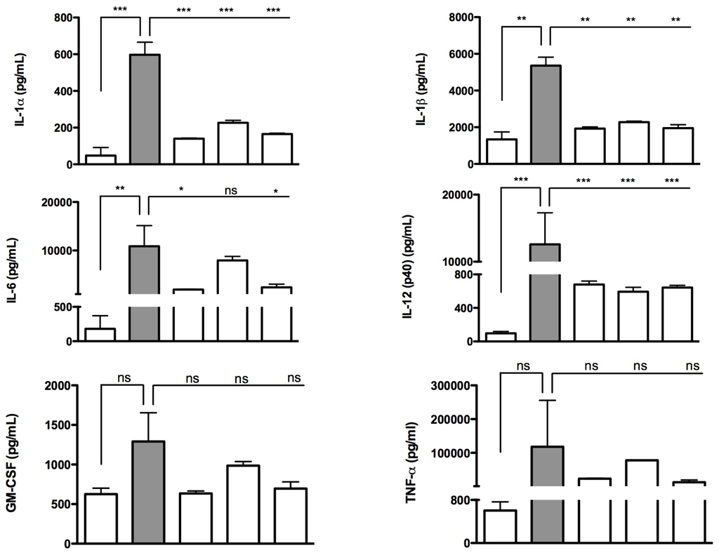 Deregulated cytokines after treatments on Raw 264.7 cells. Phytol 100 μM (Phy 100) and geranylgeraniol 100 μM (GGOH 100) were dispensed after the alendronate (Ald 100 μM) + lipopolysacchardide (LPS 10 μg/mL) treatment. Lycopene 15 μM (LYC 15) was given as a pre-treatment 2 h before the Ald + LPS treatment. The concentration values of cytokines (pg/mL) were obtained from experiments performed in triplicate. IL-1α, IL-1β, IL-6 and IL-12 were significantly modulated with isoprenoids treatments. * p < 0.05; ** p < 0.01; *** p < 0.001; ns = not significant after one way ANOVA test followed by the Bonferroni correction for multiple comparisons.