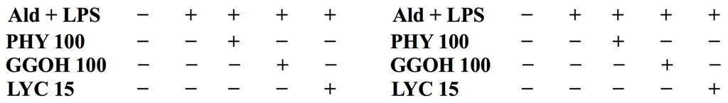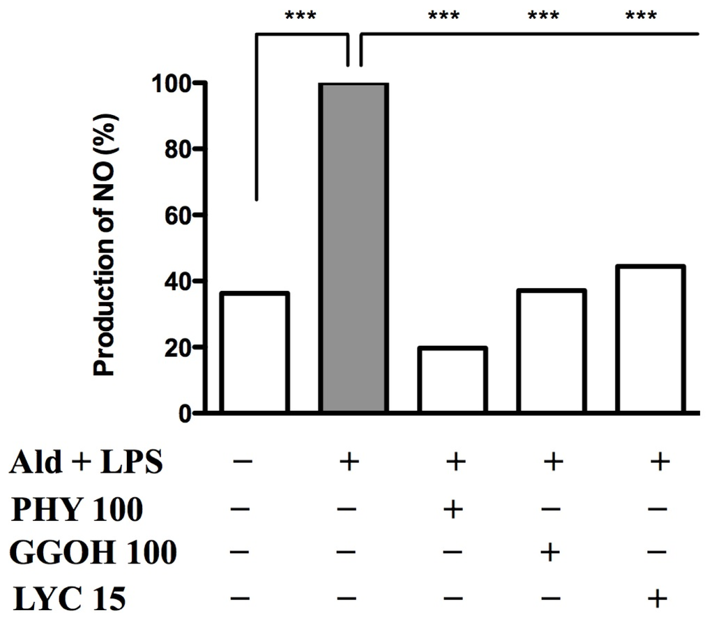 Nitric oxide (NO) values were evaluated in Raw 264.7 cells treated with Ald + LPS. This treatment induced a significant production of NO when compared to untreated conditions (Ald + LPS: 100%; untreated: 36.3%), in accordance with previous studies [17]. We then evaluated the effects of PHY, GGOH and LYC using this cellular model, in which the inhibition of the mevalonate pathway was able to amplify LPS-induced inflammation. All tested compounds reduced NO production (PHY: 19.7%; GGOH: 37.1%; LYC: 44.4%) compared to Ald + LPS (100%). As shown in Figure 7, all three isoprenoids were able to significantly reduce the Ald + LPS-induced NO production.