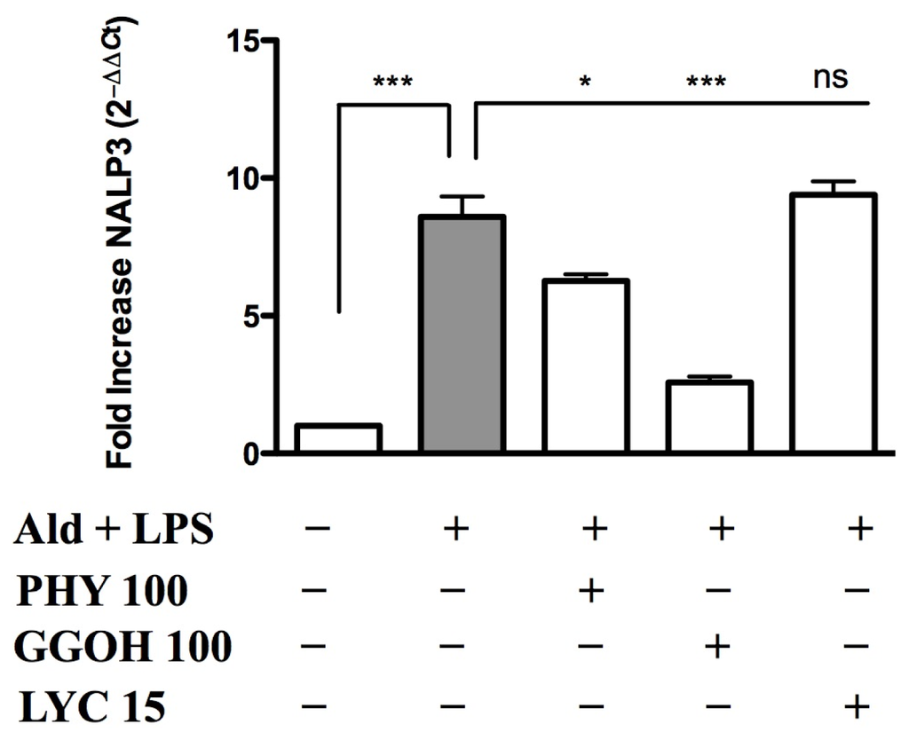 NALP3-inflammasome expression in Raw 264.7 cells. Expression of NLRP3/NALP3 was measured after Alendronate (100 μM) + LPS (10 μg/mL) treatment alone or in combination with phytol 100 μM, GGOH 100 μM or LYC 15 μM treatments. Analyses were performed using real time quantitative polymerase chain reaction (PCR), and results were normalized to ACTB expression. Expression of untreated cells was normalized to 1. Expression data for the three experiments are reported as 2−ΔΔCt average ± SD, in which ΔΔCt = ΔCt_stimulated HC–ΔCt_RHC. Data analyses were performed with one-way ANOVA and Bonferroni correction comparing Ald + LPS treated cells with the other experimental conditions; * p < 0.05; *** p < 0.001; ns: non significant.