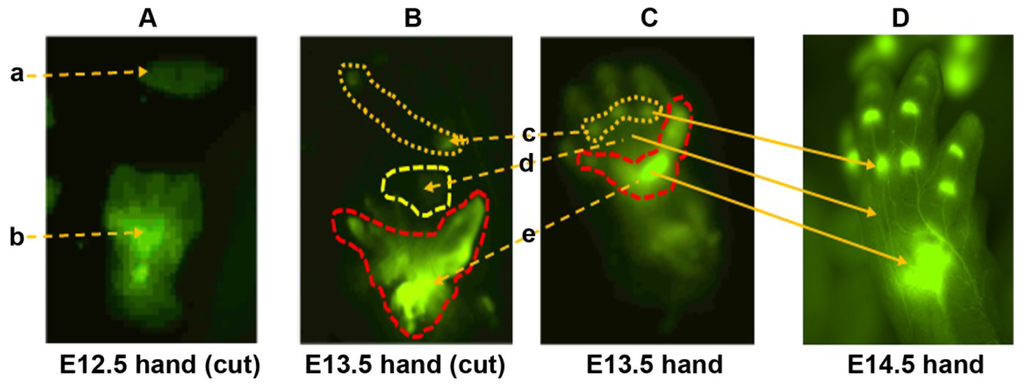 Illustration of dissection of mouse embryonic handplates. (a) the distal region (DCX-eGFP-negative); (b) the proximal region (DCX-eGFP-positive); (c) the metacarpal-phalange region (DCX-eGFP-positive); (d) the metacarpal region (DCX-eGFP-negative); (e) the carpal region (DCX-eGFP-positive). All photomicrographs were taken under an epifluorescence microscope with 6× (A); 1.3× (B) and (C); and 1× (D) original magnification.