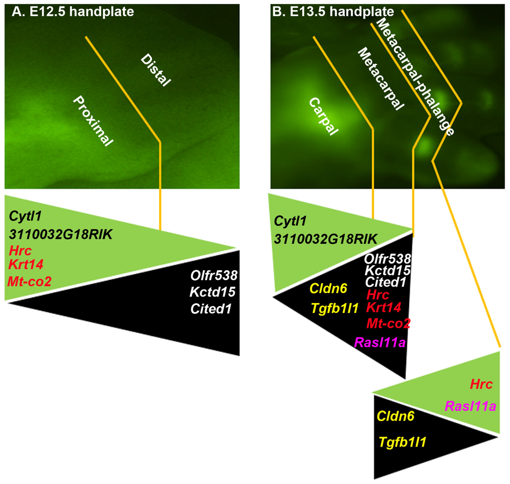 Comparison analysis of gene expression patterns between different regions. (A) E12.5 mouse handplate (original magnification, 6×); (B) E13.5 mouse handplate (original magnification, 1.3×). Selected genes are shown with their gene symbols color-coded and the ones with the same color are in comparison between the different regions. The genes are laid on colored triangles, the base of each triangle indicating higher levels of gene expression with the tip indicating lower levels of gene expression; green triangles indicate higher levels of gene expression in the DCX-eGFP-positive regions, whereas black triangles indicate higher levels of gene expression in the DCX-eGFP-negative regions.