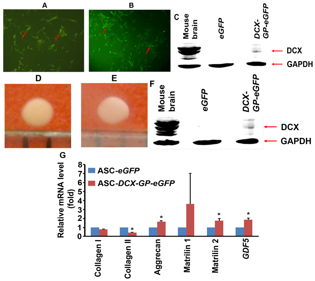 The effects of DCX expression on chondrocyte differentiation of human ASCs in pellet cultures. (A) and (B) Human ASCs transduced with HRST-eGFP (A) and HRST-DCX-GP-eGFP (B) lentiviruses and sorted by flow cytometry; arrows indicate eGFP-positive cells; original magnification, 200×; (C) Western blot analysis of the sorted human ASCs; mouse brain serves as a positive control; (D) and (E) Representative photomicrographs of the cartilage-like tissues derived from HRST-eGFP-transduced ASCs (D) and HRST-DCX-GP-eGFP-transduced ASCs (E); (F) Western blot analysis of the proteins extracted from the cartilage-like tissues; (G) qRT-PCR analysis of gene expression in the cartilage-like tissues. Data represent mean ± SD (error bars) of three independent experiments; the difference between the ASC-eGFP and ASC-DCX-GP-eGFP groups was statistically significant (* p < 0.05).