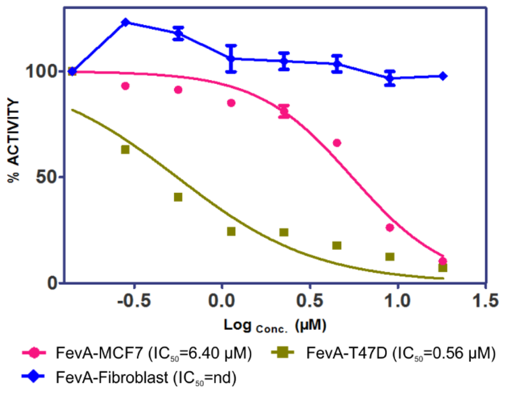 Cell proliferation inhibition profiles of FevA in MCF-7, T-47D, and fibrolast (as control) cell lines.