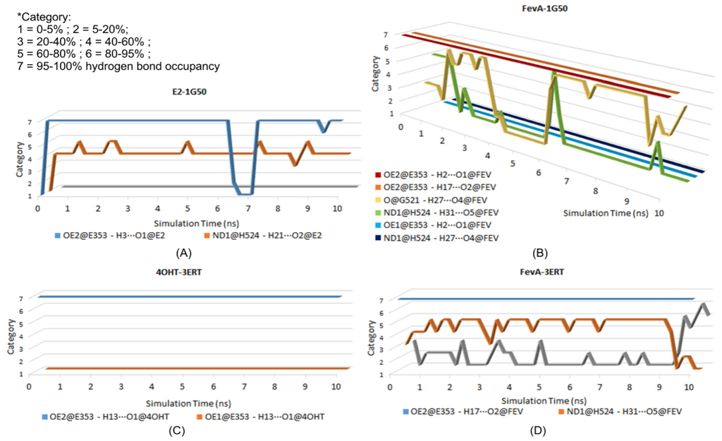 The time evolution of the hydrogen bonding occupancy is defined into seven categories. Category 1, 2, 3, 4, 5, 6, and 7 are 0%–5%, 5%–20%, 20%–40%, 40%–60%, 60%–80%, 80%–95% and 95%–100% of hydrogen bond occupancy, respectively. Figure 10A showed that in the E2-1G50 system, the OE2 atom of E353 constantly formed a hydrogen bond with the O1 atom of E2 except for some length of times in between 6 and 7 ns (0%–5% occupancy) but increased to above 80% occupancy until the end of 10 ns of simulation. From the figure, there was also a small chance for the carboxylate group of E353 to rotate and allow its OE1 atom to form a hydrogen bond with E2 (0%–5% occupancy). On the other hand, Figure 10B showed that hydrogen bonds between FevA and G521 and H524 could not be formed simultaneously. At the first nanosecond, the hydrogen bond formed with H524 was more dominant than with G521. However, G521 consistently stabilized FevA in the binding site by the hydrogen bond until 4 ns. In between 5 and 6 ns, H524 regained its hydrogen bonding formation but later shifted again to G521. This implied that FevA required conformational adjustment to shift the hydrogen bond from G521 to H524 or vice versa. This phenomenon was also observed in FevA-3ERT (Figure 10D). At the final nanosecond of simulation, the hydrogen bonding occupancy of H524 had decreased and was replaced by the hydrogen bond with the main chain of G521. As for the 4OHT-3ERT system, the hydrogen bond between 4OHT and OE2 atom of E353 was observed to maintain 95%–100% of occupancy (Figure 10C).