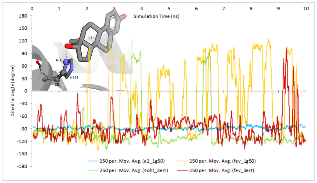 Time evolution of dihedral rotation of CA-CB-CG-ND1 angle in all the simulated systems throughout the 10 ns. The graph indicated that the side chain of H524 was stabilized in the presence of E2 and 4OHT. FevA appeared to destabilize the H524 especially in the agonist system (FevA-1G50).