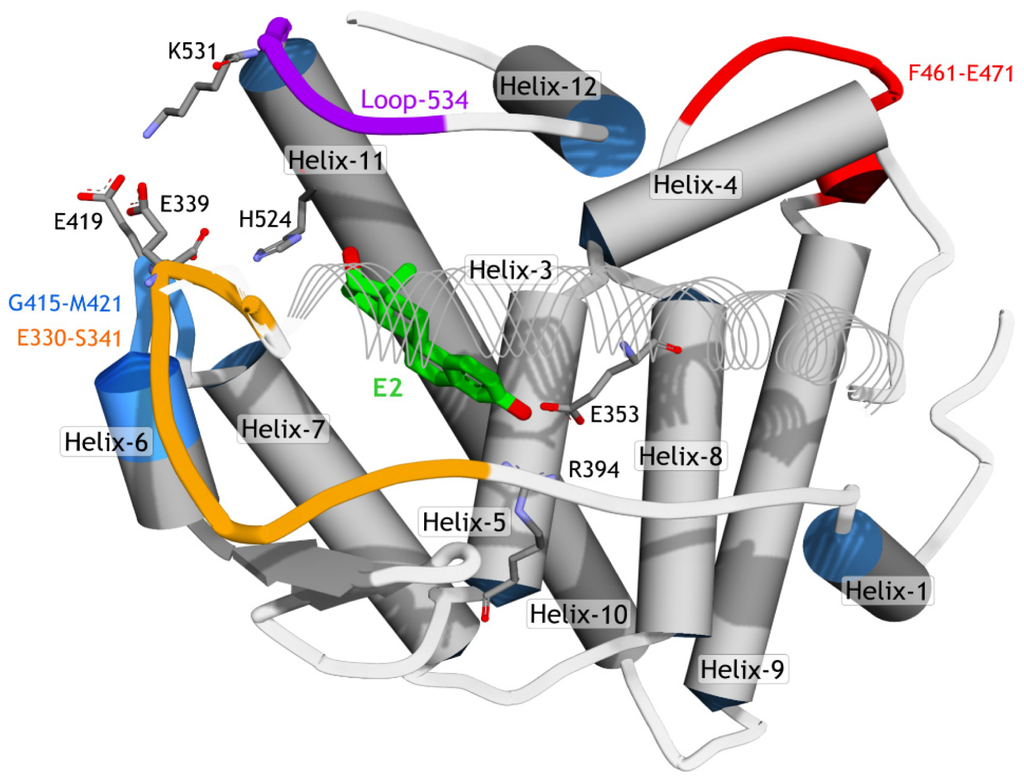 The schematic of hERα structure (PDB ID 1G50). To improve the visibility of the ligand (E2), Helix-3 is represented in line ribbon style.