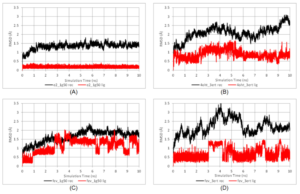 Time evolution RMSD of protein backbone (black line) and ligand (red line) throughout the 10 ns MD simulation time for (A) E2-1G50; (B) 4OHT-3ERT; (C) FevA-1G50; and (D) FevA-3ERT systems.