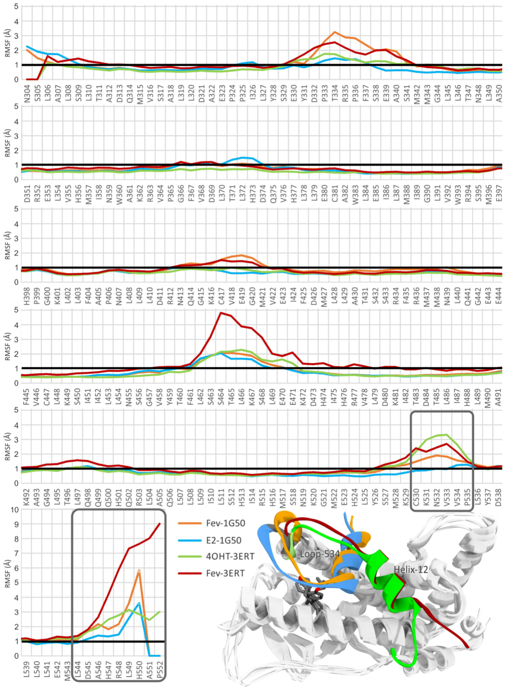 Average RMSF of amino acid residues of hERα in all the simulated systems. Inset is the superimposition of the average MD structures of E2-1G50, FevA-1G50, 4OHT-3ERT, and FevA-3ERT which are highlighted on the different conformations at Loop-534 and Helix-12 (blue, orange, green, and red colors, respectively).