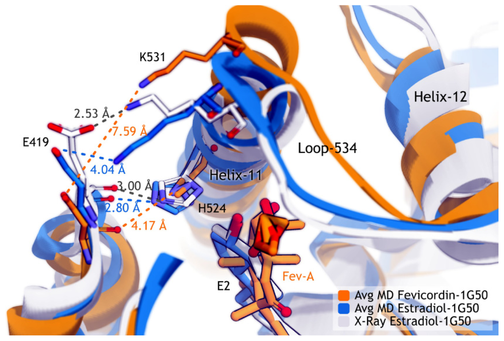 The average MD structure of FevA-1G50 (agonist-form receptor) showed that FevA repulsed the C-terminal of Helix-11 which led to the disruption of the hydrogen bond network between E419, H524, and K531. Celik et al. [] discovered that this hydrogen bond network is important to ensure that Helix-3 and Helix-11 are in close contact. Following this, the restrained Helix-11 would force Helix-12 to be positioned in the “mouse trap” as no other favorable (antagonist) conformation is available on the surface of the hERα ligand binding site. The investigation of the crystal structure of hERα in the antagonist-form complexed with 4OHT (PDB ID 3ERT []) revealed that this hydrogen bond network did not exist, which might be due to the antagonistic activity of 4OHT. Therefore, the broken hydrogen bond network in the agonist-form receptor due to the presence of FevA, might support the suggestion that FevA has antagonistic action. Moreover, H524 has also been postulated to have an important role in the formation of the hydrogen bond network with Helix-3 and Helix-11 []. However, based on the dihedral rotation and hydrogen bond analysis, H524 in the FevA-1G50 system was not well stabilized by FevA. The free rotation of the H524’s side chain in this MD system still occurred even though we had already assigned the protonation state of H524 in the ɛ-tautomer as suggested from the structural analysis of 1G50. This has also been well discussed as being the most stable tautomer in the previous MD simulation []. Thus, we suggest that the free rotation of H524’s side chain results from the presence of FevA, especially the shifting of hydrogen bond formation from G521–H27···O4 to H524–H31···O5 (and vice versa) during the 10 ns of MD simulation.