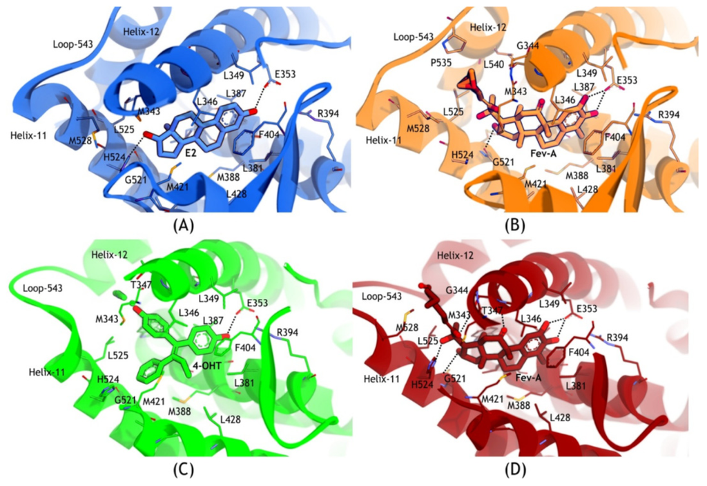 In addition, the tails of FevA and 4OHT had an additional interaction with W383. In the FevA-1G50 system, loop-534 was in close conformation which made more interactions with the tail of FevA through the residues V533, V534, P535, and L540. In all of the four systems, E353 had a conserved hydrogen bond with all the ligands. H524 also had a conserved hydrogen bond acceptor with E2 and FevA but not with 4OHT. Furthermore, in the FevA-3ERT system (Figure 9D), FevA was shown to form hydrogen bonds with T347, A350, and G521 as well as E353 and H524.