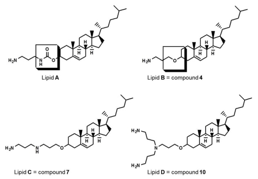 Structures of cholesterol-based cationic lipids. Lipid A has a carbamoyl-linked structure and lipids B–D have ether-linked structures.