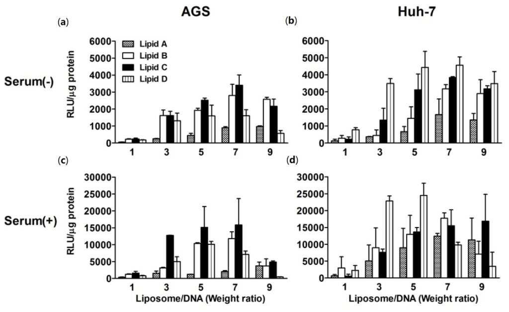 A series of experiments were performed using an optimal lipid:DOPE ratio, as determined above, to further assess the transfection properties of liposomes. Transfection efficiencies at different N/P weight ratios in AGS and Huh-7 cells were measured using a luciferase assay (Figure 3). Transfection efficiencies of each liposome showed different results depending on the liposome/DNA weight ratio. The optimal conditions were different for AGS and Huh-7 cells, and the presence of serum caused marked changes in luciferase activity. In AGS cells, liposomes B and C were generally more potent in delivering DNA than liposomes A and D in the presence (Figure 3c) and absence (Figure 3a) of serum, regardless of the N/P weight ratios. In Huh-7 cells, however, liposome D induced higher luciferase activity than other liposomes in the absence of serum at all the N/P weight ratios tested (Figure 3b). Liposome D also induced higher luciferase activity than other liposomes in the presence of serum at weight ratios between 3 and 5 (Figure 3d).