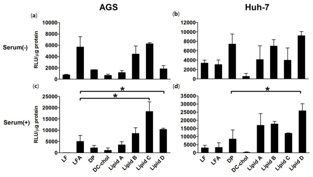 Transfection efficiencies compared to commercial liposomes. The transfection efficiencies of liposomes A–D were compared to that of commercial liposomes at optimal N/P weight ratios (5 for Lipofectin (LF) and Lipofectamine (LFA), and 7 for DOTAP/DOPE (DP) and DC–Chol) in AGS (a,c) and Huh-7 (b,d) cells by using a luciferase assay. The concentration of DNA (0.2 μg/well) was kept constant. The incubations were performed in the presence (c,d) and absence (a,b) of serum. Bars represent the mean ± SD of experiments performed in triplicate. * p < 0.05 vs. LFA (A,C) and DP (B,D).