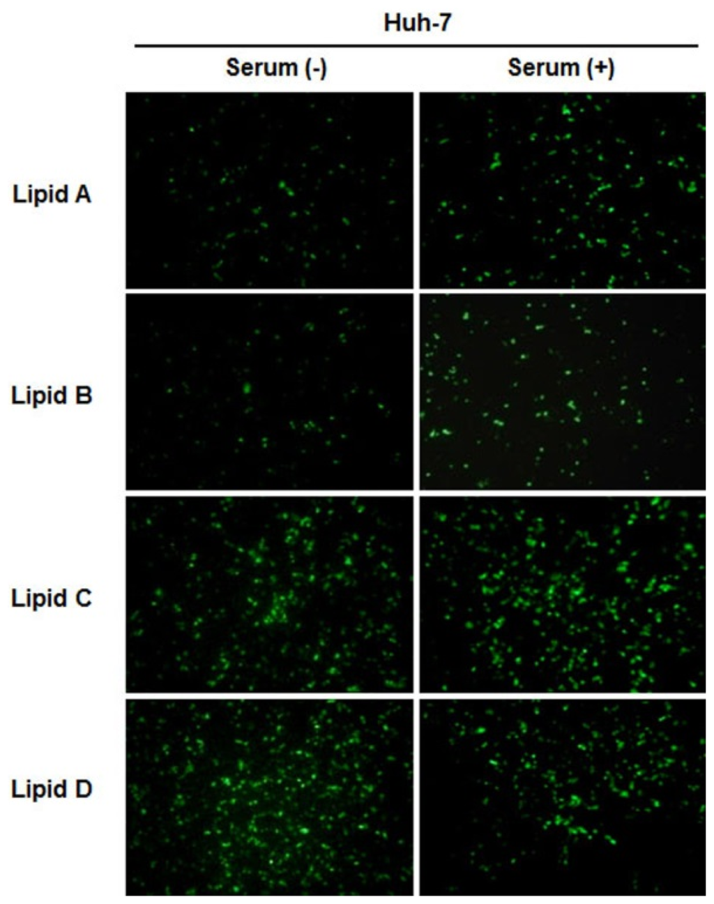 Expression of GFP delivered using liposomes A–D. The plasmid pCMVTnT-GFP (0.3 μg) was complexed with liposomes A–D and applied to Huh-7 cells. At the end of the transfection period, cells were examined under a fluorescent microscope.