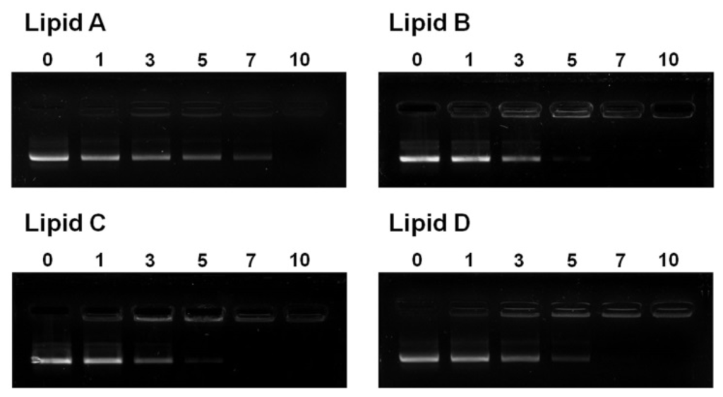 For cationic liposome- and polyamine-mediated transfections, electrostatic interaction between the DNA/carrier complex and the anionic plasma membrane is the first step [33]. To investigate the electrostatic binding interaction between DNA and the cationic liposomes, an electrophoretic gel retardation assay was performed. Representative electrophoretic gel patterns of liposome/DNA lipoplexes are shown in Figure 7. The liposomes were capable of completely inhibiting the electrophoretic mobility of plasmid DNA contained within lipoplexes prepared at N/P weight ratios higher than 10. At an N/P weight ratio of 7, free DNA migrated for liposome A, but not for liposomes B–D. Such gel patterns are consistent with the relatively weak liposome/DNA binding interactions of liposome A, which has the greatest amount of cationic lipids in the absence of the neutral lipid DOPE (cationic lipid/DOPE weight ratio is 3:1 for B and >1:1 for C and D). This result is consistent with the observation that the transfection efficiency of liposomes was the highest in luciferase assays at an N/P weight ratio of 7–10 for lipid A and 5–7 for lipids B–D (Figure 3). These data imply that liposomes are not sufficient to bind DNA at N/P weight ratios under 3 or 5. In addition, ratios over 7 or 10 are too high for the interaction with cell membranes.