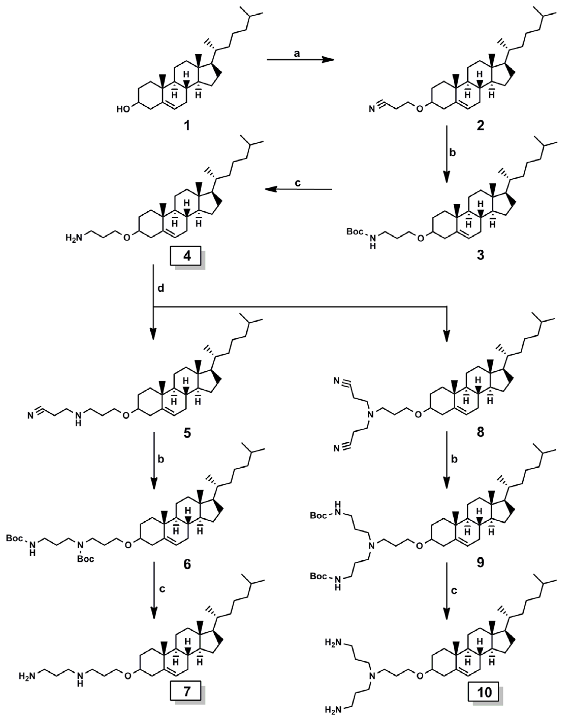 Cholesterol-based cationic lipids with ether linkages were synthesized (Scheme S1) according to a method previously described [17]. To compare ether synthesized by cyanoethylation and carbamoyl linkages on the cholesterol backbone, we synthesized lipid A (Figure 1), which contained a carbamoyl-linked propylamine head that was easily synthesized from cholesteryl chloroformate, using the methods described by Tsutomu et al. [31]. Structures of all the synthetic intermediates and target lipids shown in Scheme S1 were confirmed by proton nuclear magnetic resonance (1H-NMR). Final compounds were analyzed using gas chromatography mass spectrometry (GC–MS) and fast atom bombardment mass spectrometry (FAB–MS) to confirm the identity of the molecular ions.