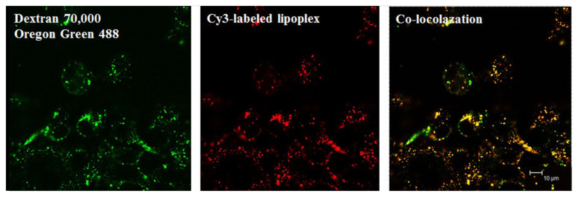 COS-7 cells were seeded onto 12 mm coverslips at a density of 6 × 104 cells in 24-well plates for 24 h. The plasmid was covalently labeled with the Label IT Cy3 nucleic acid labeling kit (Mirus, Chicago, IL, USA). Oregon Green 488 dextran; 70,000 MW (50 μg/400 μL, Molecular probe, Leiden, The Netherlands) and Cy3-labeled DNA using liposome B were added to the cells for 1 h to allow simultaneous uptake in the presence of serum. Cells were fixed with 500 μL of 4% paraformaldehyde for 10 min at room temperature. Fluorescence images were taken via confocal microscopy (Leica TCS SP2, Solms, Germany) in sequential mode to eliminate emission cross-talk between two dyes.