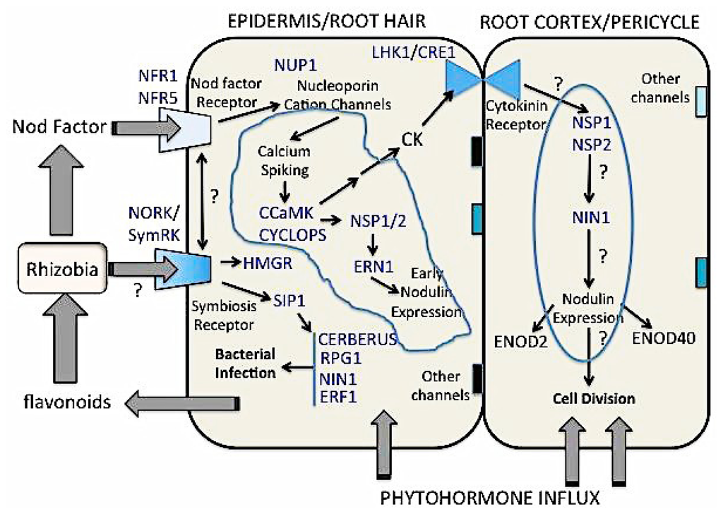 Figure 1. Early nodulation gene cascades in legumes. Flavonoids released by the plants are detected by compatible bacteria in the rhizosphere leading to production of Nod factors (NF), which are perceived by a dimer receptor made up of LysM type receptor kinases NFR1 and NFR5 at the root epidermis. This triggers the downstream gene cascade including those involved in nucleoporin, cation channels, calcium spiking, early nodulin expression and cytokinin signalling leading to cortical and pericycle cell divisions, and concomitant bacterial infection.