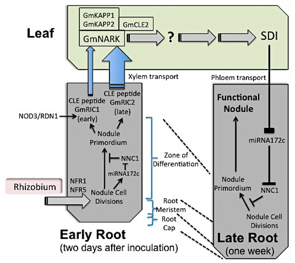 It is now known that autoregulation signals (CLE peptide hormones, GmRIC1 and RIC2 (G. max), CLE12 and CLE13 (M. truncatula) and RS1 and RS2 (L. japonicus)) are generated in response to inoculation and early cell division in the roots of nodulating plants. This root-derived signal (called Q in the original AON model of Gresshoff and Delves [19]) is transmitted via the xylem to the shoot [34] where its perception leads to the formation of another signal, called the shoot-derived inhibitor (SDI) [19,35]. This is then transported back to the roots where it acts to inhibit further nodulation by arresting early cell division stages. Inhibition of cell division by the autoregulatory signal occurs even earlier for indeterminate nodulating legumes (like M. truncatula) where autoregulated regions of the root are actually devoid of visibly arrested major nodule meristems, compared to soybean. In soybean, such arrested stages are released for fast nodule formation if the existing nodules are removed.
