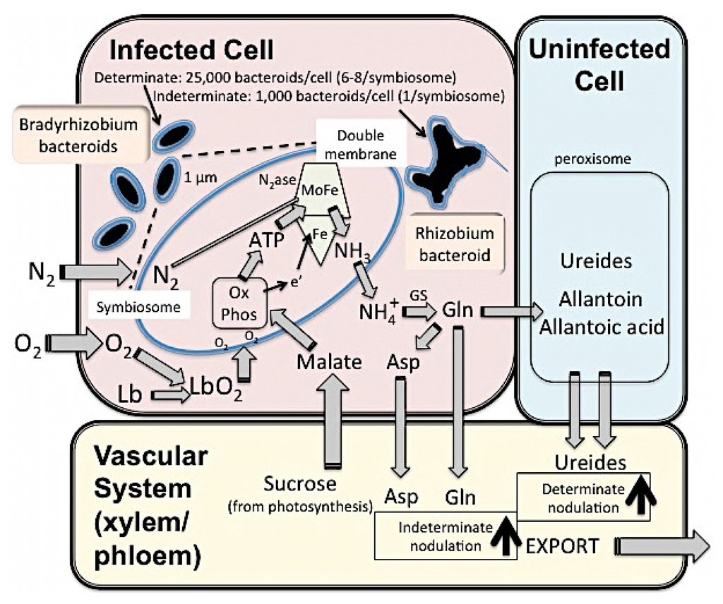 Figure 3. Schematic mechanisms of symbiotic nitrogen fixation in a legume nodule. N2 entering the symbiosome is converted to NH4+ by the nitrogenase enzyme complex of the bacteria using ATP and an electron donor. The NH4+ is then converted to glutamine via glutamine synthase (GS) and asparagine. Glutamine is exported from the infected cell to uninfected cells where in the peroxisomes ureides, such as allantoin and allantoic acid are synthesised. All the nitrogen transport molecules (Gln, Asp, ureides) are exported to and transported via the vascular system to the rest of the plant. Note that indeterminate and determinate differ in their spectrum of transport molecules. Ureides are highly beneficial as their have a 1:1 carbon:nitrogen ratio (compared to 2:1 for glutamine and asparagine).