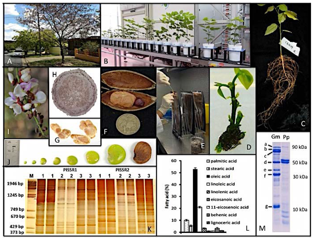 Figure 4. The biological properties of Pongamia, a biofuel feed stock tree with potential. (A) Street trees in Brisbane (Australia) during spring (late November). Note the variable spring leaf burst caused by genetic heterogeneity. Such variation is a problem for the producer, but a benefit to the experimenter; (B) Pongamia plants grown for analysis in the Adelaide Automated Growth Facility; (C) Pongamia seedling plant with nodules induced by Bradyrhizobium japonicum strain CB1809, a common Australian soybean inoculum; (D) Pongamia growing in tissue culture. Clonal regenerants from immature cotyledons are now growing in fields; (E) Pouch growth of Pongamia seedlings allows nodulation studies; (F) Pongamia pod and seed (about 20 mm long seed; about 2 g/seed). Pod casing potential can be co-fired for electricity formation; (G) Pongamia nitrogen-fixing root nodules (about 2–3 mm in length four weeks after inoculation); (H) Pongamia root nodule close-up (about 3 mm in diameter). Bacteria are housed as bacteroids in the interior; (I) Pongamia flowers (pea-like; about 6–8 mm in length); (J) Pongamia seed development: Takes 10–12 months from fertilisation to harvest of dry seed; (K) Pongamia genetic diversity testing. PISSR markers (Pongamia Interstitial Single Sequence Repeats) based genomic DNA sequence separated by polyacrylamide gels electrophoresis and silver stained (Bassam and Gresshoff, Nature Protocols, 2007); (L) Pongamia seed oil composition derived from one seed of tree HS-62; (M) Pongamia seed cake components stained for protein. Left lane: soybean (Gm); right: Pongamia (Pp). (a) lipoxygenase (90 kDa); (b) 7Sα prime (70 kDa); (c) 7Sα (66.4 kDa); (d) 7Sβ conglycinin (51 kDa); (e) 11SAβ (41 kDa); (f) 11SA1a, A1b, A2 (38.5 kDa); (g) sB1a, B1, B2, B3, 11SB4 (10 kDa). The genes for the main Pongamia pinnata seed storage proteins (50 and 52 kDa) were cloned and shown to be similar to the low quality seed storage protein 7S β conglycinin.