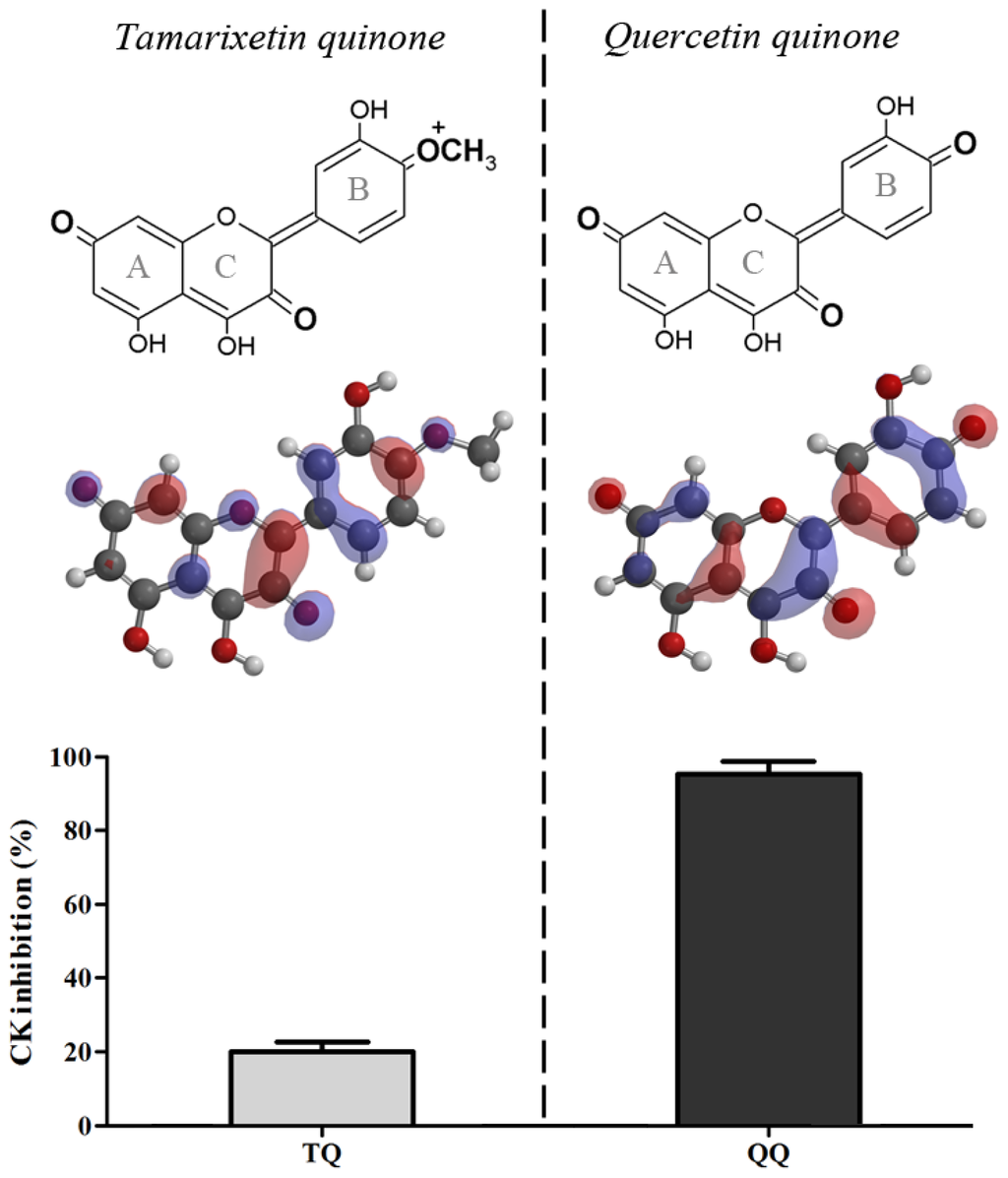 Structure and Lowest Unoccupied Molecular Orbital (LUMO) localization map of the preferred tautomer of quercetin quinone and tamarixetin quinone, and the effect of quercetin and tamarixetin oxidation on the enzyme activity of creatine kinase (CK). The carbonyl groups of quercetin quinone are positioned at maximal distance within the molecule and the LUMO is distributed over the phenolic rings, which explains why it behaves as a soft electrophile. Tamarixetin quinone has a positive charge and the LUMO is focused in the B-ring, which makes it a relatively hard electrophile. Quercetin and tamarixetin (50 μM) were oxidized by 50 μM H2O2 and 0.4 or 3.2 nM horseradish peroxidase (HRP), respectively, to obtain an equal rate of oxidation (5 μM/min). In the presence of 6.2 μM CK, the enzyme activity of CK was measured. Data are shown as mean ± SE (n = 4).