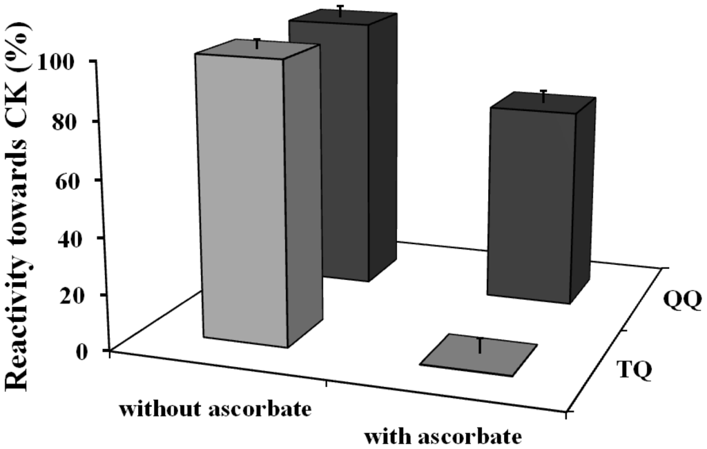 Ascorbate only slightly protected against the inhibition of the activity caused by quercetin quinone (from 95% to 72%). In contrast, ascorbate completely protected the enzyme against the inactivation by the tamarixetin quinone, because the activity of CK was fully retained (Figure 2).