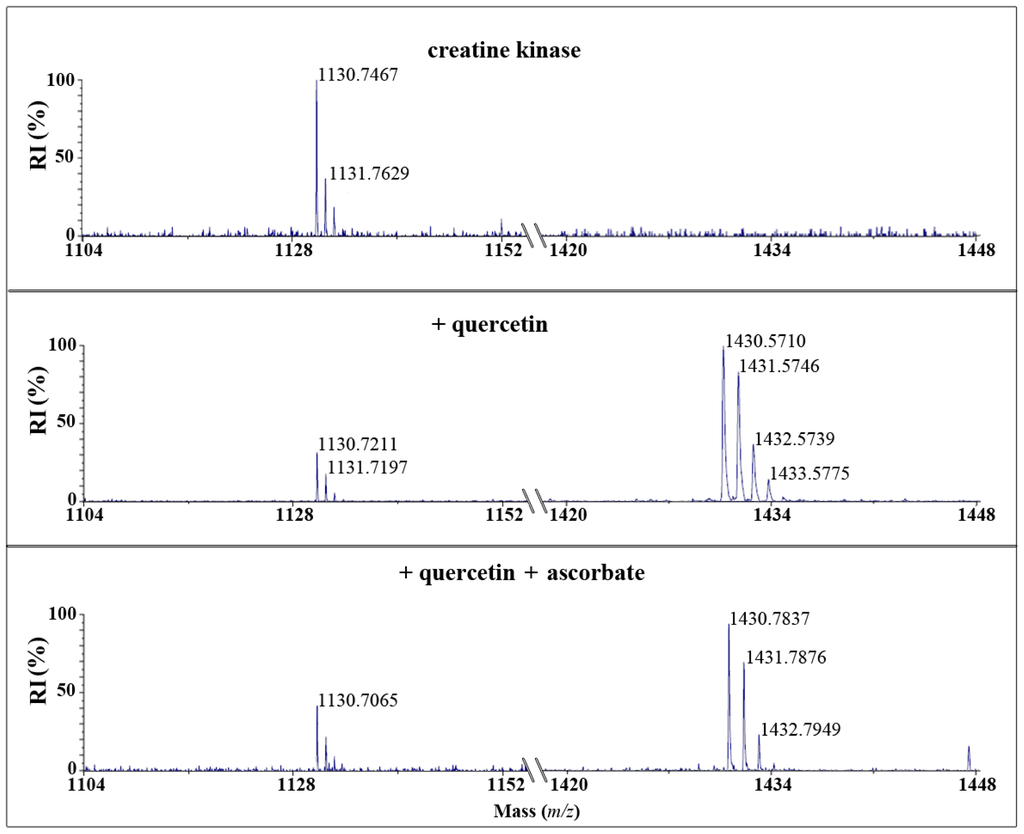 MALDI-ToF analysis of isolated creatine kinase (CK) (0.5 mg/mL) incubated with 50 μM quercetin, 0.4 nM HRP and 50 μM H2O2 with or without 50 μM ascorbate for 5 min at 37 °C. After trypsin digestion the mass spectrum of digested CK was measured. The control spectrum of CK displayed a peak at m/z 1130 and no peak at m/z 1430. The incubation with quercetin showed a peak at m/z 1430 which corresponds to the mass of the adduct of quercetin quinone (300 dalton) with the peptide having mass m/z 1130, whereas the peak at m/z 1130 decreased. The amino acid sequence of the peptide is GYTLPPHCSR, containing cysteine 146. The spectrum of CK incubated with quercetin in combination with ascorbate also showed a peak at m/z 1430. The peak at m/z 1130 was also present, but the relative intensity (RI) was less than the untreated CK.