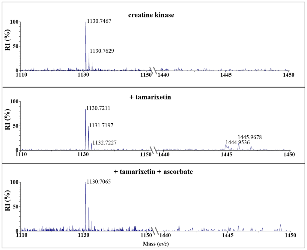 MALDI-ToF analysis of isolated creatine kinase (CK) (0.5 mg/mL) incubated with 50 μM tamarixetin, 3.2 nM HRP and 50 μM H2O2 with or without 50 μM ascorbate for 5 min at 37 °C. After trypsin digestion the mass spectrum of digested CK was measured. The control spectrum of CK displayed a peak at m/z 1130 and no peak at m/z 1444. The incubation with tamarixetin showed a peak at m/z 1444 which corresponds to the mass of the adduct of tamarixetin quinone (314 dalton) with the peptide having mass m/z 1130, whereas the peak at m/z 1130 decreased. The amino acid sequence of the peptide is GYTLPPHCSR, containing cysteine 146. The spectrum of CK incubated with tamarixetin in combination with ascorbate did not show a decrease in the intensity of the peak at m/z 1130 and an increase at m/z 1444.