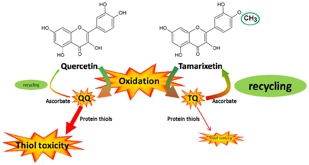 The present study addresses the selective toxicity of flavonoid antioxidants. Flavonoids pick up the reactivity of radicals and act as a pivot to channel the reactivity (Figure 5). Quercetin quinone channels its reactivity selectively towards thiol toxicity. The low but selective reactivity of oxidized antioxidants that directs the reactivity to a focal point (in this case thiols) has been implicated in the toxicity of antioxidants []. The selective reactivity of tamarixetin quinone directs the reactivity towards ascorbate in the antioxidant network. This might explain why tamarixetin is found to be less toxic than quercetin in cells []. Apparently, the introduction of only one methyl group in quercetin, giving tamarixetin, leads to a remarkably high reduction of the selective, thiol toxicity.
