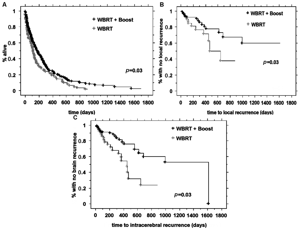 Comparison of whole brain radiation therapy (WBRT) alone and WBRT plus boost in (A) overall survival; (B) local control and (C) brain free-relapse survival.