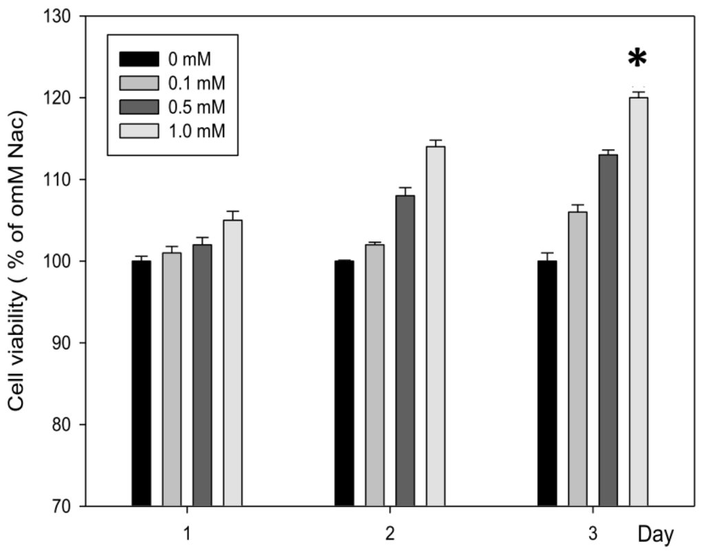MTT (3-(4,5-dimethylthiazol-2-yl)-2,5-diphenyltetrazolium bromide) assay was performed to determine cell viability. Cells were seeded at a density of 1 × 104 cells/mL in a 24-well plate for 24 h. The cells were then treated with Nac at various concentrations (0, 0.1, 0.5, and 1.0 mM) for 1, 2, and 3 days. Afterwards, the medium was changed and incubated with MTT solution (5 mg/mL)/well for 4 h. After removing the medium, formazan was solubilized in isopropanol and measured spectrophotometrically (Hatachi 3210, Hitachi, Tokyo, Japan) at 563 nm.