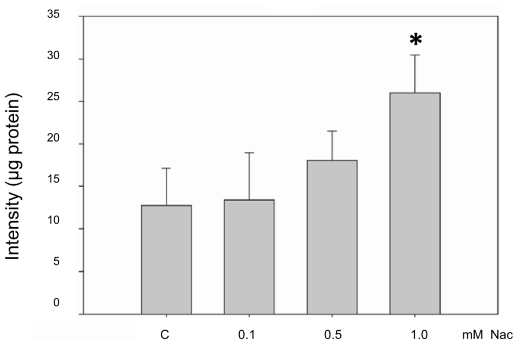 Nac has been reported to stimulate GSH synthesis, enhance GSH-S-transferase activity, promote detoxification, and act as a scavenger of free radicals in the liver [23]. Thus, we evaluated the effects of Nac on GSH in CCD-966SK cells. The contents of GSH in the CCD-966SK cells obtained from the control and cells treated with 0.1 mM of Nac were similar, and the GSH level was slightly increased in the cells exposed to 0.5 mM Nac. Nevertheless, the GSH level in the cells treated with a higher concentration of Nac (1.0 mM) significantly increased to approximately double that of the controls (Figure 2).