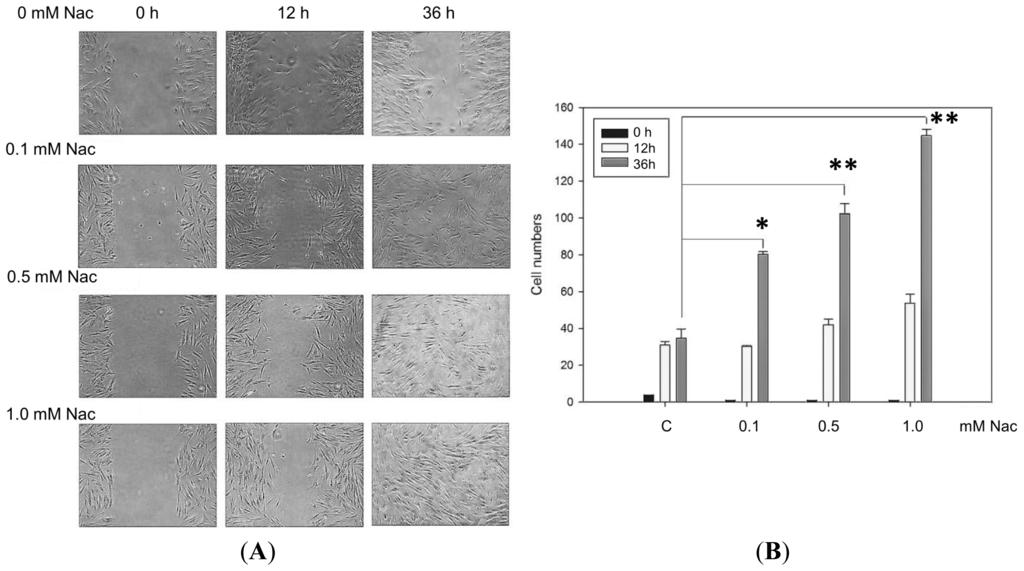 Wound healing analysis of the CCD-966SK cells treated with Nac. (A) The treated cells were cultured in a six-well plate after monolayer wounding with a yellow P200 pipette tip. The healing ability was observed using phase contrast microscopy on an inverted microscope after 12 and 36 h; (B) Quantitative assessment of the average number of cells in the denuded zone is expressed as the mean ± SD of three independent experiments. * p < 0.01; ** p < 0.001 compared with the untreated controls.