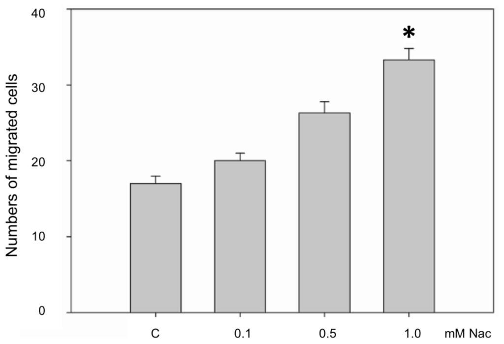 Cell migration is a highly integrated, multi-step process that plays an important role in wound healing. We tested the migratory ability of CCD-966SK cells treated with various concentrations of Nac using a Boyden chamber assay. As seen in Figure 4, Nac significantly induced the migration of CCD-966SK cells in a dose-dependent manner, whereas the migration abilities of CCD-966SK cells treated with 0.1 and 0.5 mM Nac did not differ from the controls. However, the migration activity of CCD-966SK cells treated with 1.0 mM Nac for one day was significantly higher than that of the controls.