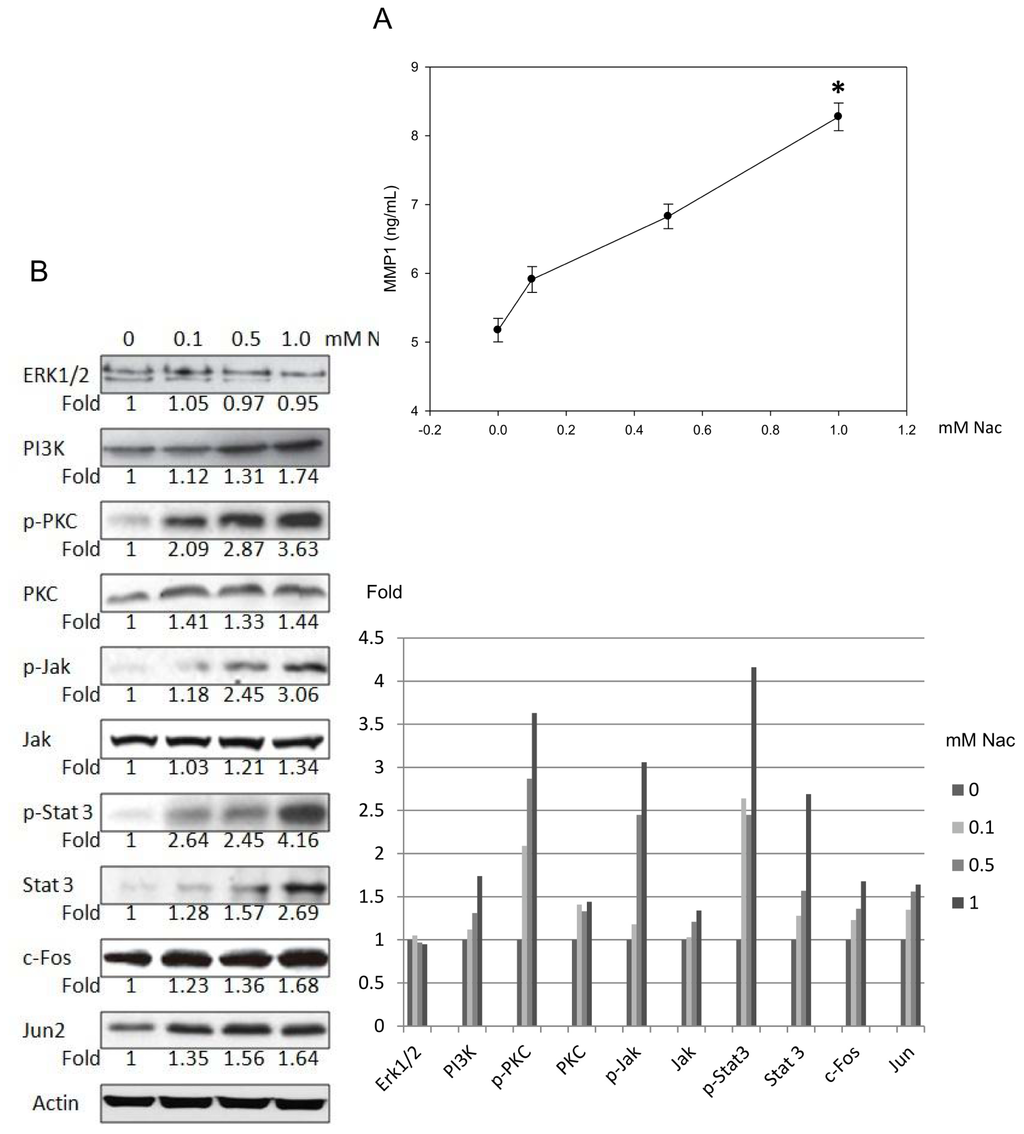 Enzyme-linked immunosorbent assays (ELISA) were used to clarify the MMP-1 expression in the CCD-966SK cells induced by Nac. As seen in Figure 5A, MMP-1 activity was induced after treatment with various concentrations of Nac in a dose-dependent manner. In addition, there was a significant increase in MMP-1 level in the CCD-966SK cells after treatment with 1.0 mM Nac for 24 h.