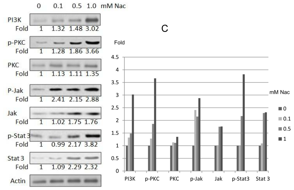 We then examined the proteins involved in regulating the expression of MMP-1. Western blot analysis showed that Nac induced dose-dependent increases in PI3K levels by 12%, 31%, and 74% compared to those of the controls. The expressions of phospho-PKC (p-PKC), PKC, phospho-Jak (p-Jak1), Jak1, phospho-Stat 3 (p-Stat 3), Stat 3, c-Fos, and Jun proteins were also increased by 263%, 44%, 206%, 34%, 316%, 169%, 68%, and 64%, respectively, compared to the controls after treatment with 1.0 mM Nac for one day. Furthermore, stimulation with various concentrations of Nac was not associated with any significant changes in extracellular signal-regulated protein kinases 1 and 2 (Erk1/2) expression (Figure 5B). In addition, in order to clarify the effect of Nac post-wounding, the wounded cells were collected and assayed for the expression of PI3K, PKC, Jak, and Stat by Western blotting. The expressions of PI3K, p-PKC, PKC, p-Jak, Jak, p-Stat 3 and Stat 3 proteins were also increased by 202%, 266%, 35%, 188%, 76%, 282%, and 132%, respectively, compared to the controls after treatment with 1.0 mM Nac for one day (Figure 5C).