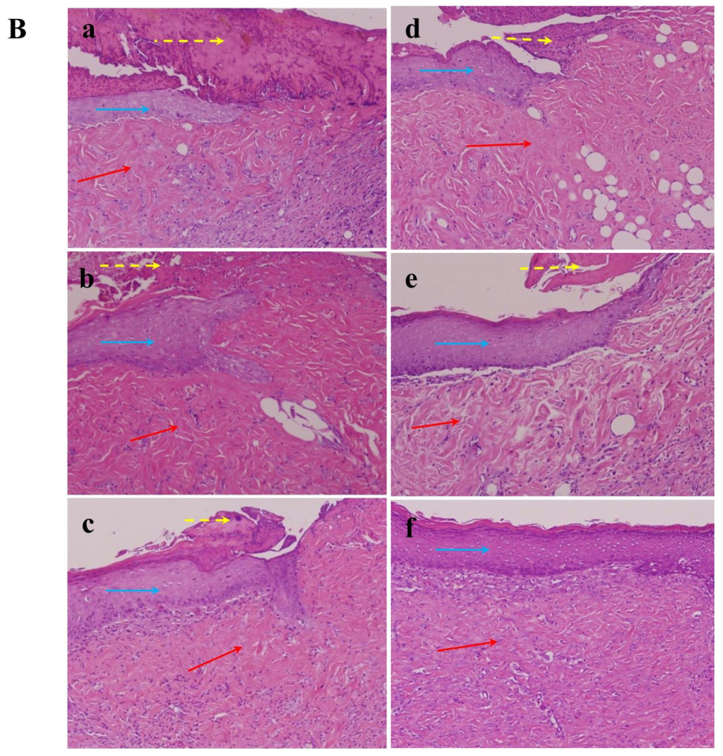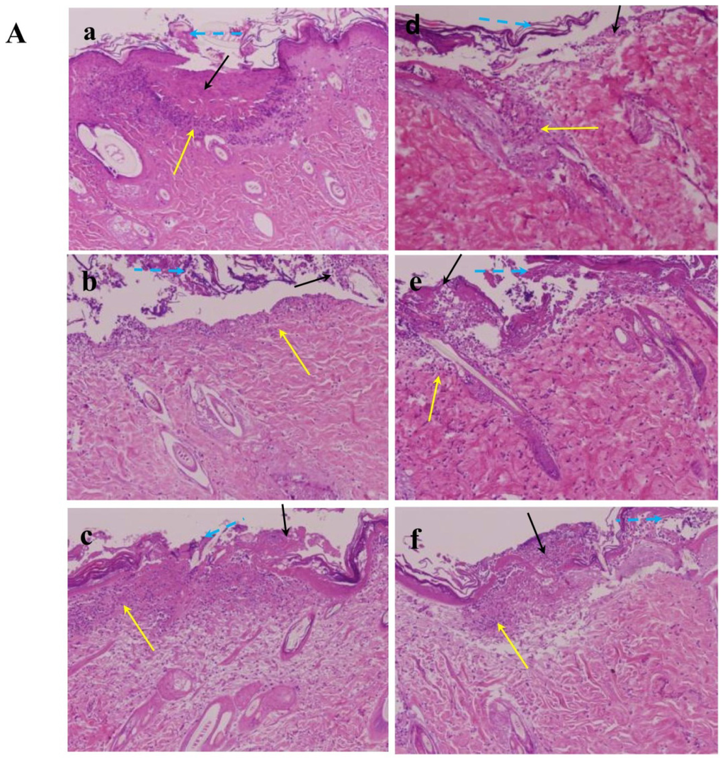 Histological features of the burn wounds on (A) day 3 and (B) day 13 after topical treatment with untreated controls (C) (a), silver sulfadiazine 1% cream (positive controls, PC) (b), Vaseline (vehicle) (c) and various concentrations of Nac (0.1%, 0.5%, 3.0%) (d–f). Yellow arrows indicate acute inflammation; black arrows indicate necrotic tissue; blue dashed arrows indicate peeling of epithelial tissue; red arrows indicate collagen formation; yellow dashed arrows indicate crust; blue arrows indicate regenerated epidermis. Photos shown are all representative of three independent experiments done in duplicate. The images in (A) and (B) show the original magnification 100×.
