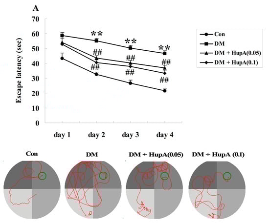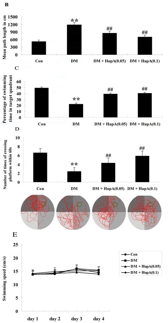 Effects of HupA on the escape latency (A); mean path length (B); mean percentage of time spent in the target quadrant (C); the number of times of crossing platform (D) and swimming speed (E) in control and diabetic rats (n = 8, mean ± S.D.). ** p < 0.01 compared with Con group; ## p < 0.01 compared with DM group. Con, control; DM, diabetes; DM + HupA (0.05), huperzine A (0.05 mg/kg)-treated; DM + HupA (0.1), huperzine A (0.1 mg/kg)-treated groups.