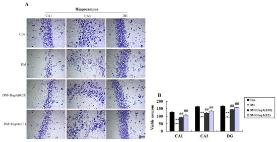 Effects of HupA on the hippocampal neuronal loss control and diabetic rats. (A) and (B) were the representative photographs of hippocampal neuronal loss and quantitative analysis of viable neurons, respectively. ** p < 0.01 compared with Con group; ## p < 0.01 compared with DM group. Con, control; DM, diabetes; DM + HupA (0.05), huperzine A (0.05 mg/kg)-treated; DM + HupA (0.1), huperzine A (0.1 mg/kg)-treated groups. Scale bar: 50 μm.